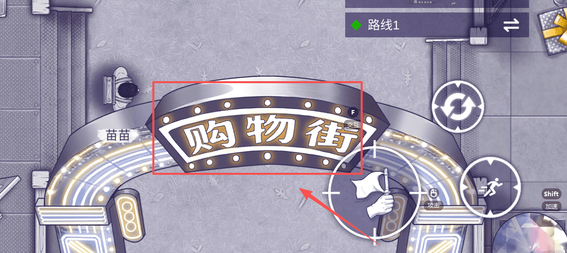 4、最后,利用路线规划功能,比如选择“路线1”,经过“苗苗”、“购物街”等地点。