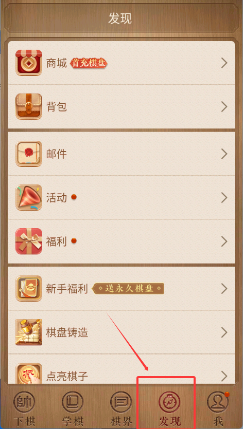 3、底部第二个图标是“发现”,点进去功能很全。“新手福利”适合刚玩的你,“邮件”可能有奖励,“棋界”能交流,多点点熟悉一下嘛。