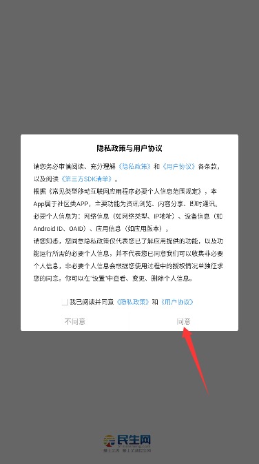 1、首次使用需阅读用户协议和隐私政策,确认无误后点击同意按钮进入应用。