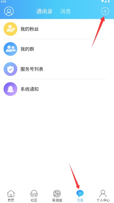 3、进入信息界面后点击右上角的加号按钮,系统将弹出多项功能操作菜单。