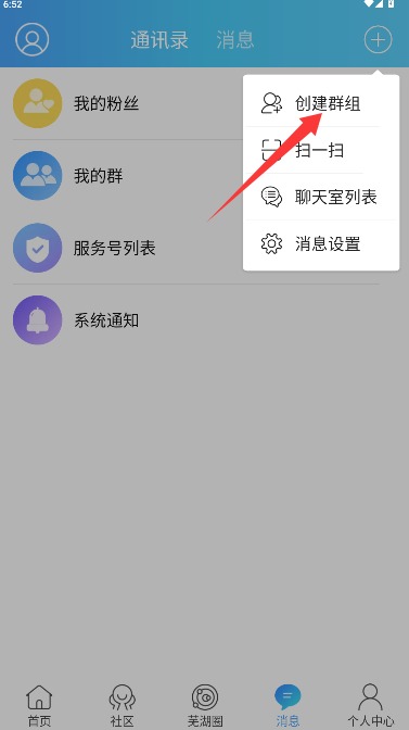 4、从菜单中选择创建群组功能,根据页面提示填写群组信息即可完成创建。