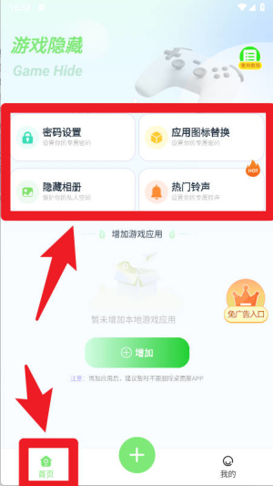 2、进入首页后,可进行密码设置、应用图标替换、隐藏相册和热门铃声等操作,让隐私保护更加全面。