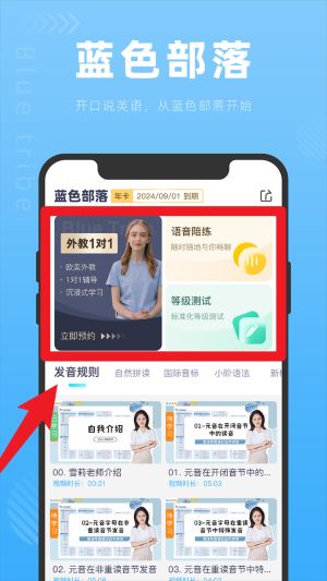 3、进入首页后可预约外教1对1课程、进行语音陪练与等级测试,为用户提供个性化的英语学习路径规划。