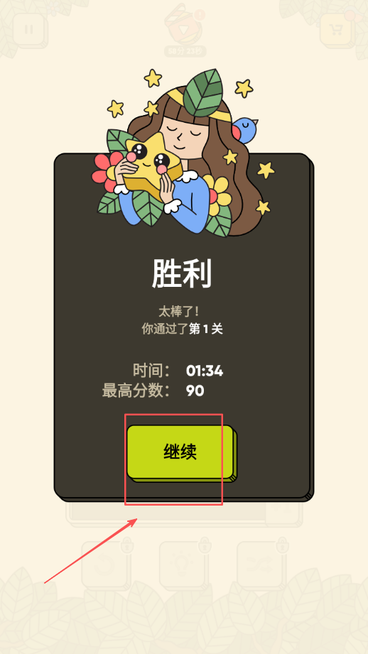 3、接着通关后点击红框继续下一关卡,了解进度系统,过关了别急着退出看看得分和评级,想刷分可以重玩本关,觉得满意就继续挑战新关卡。