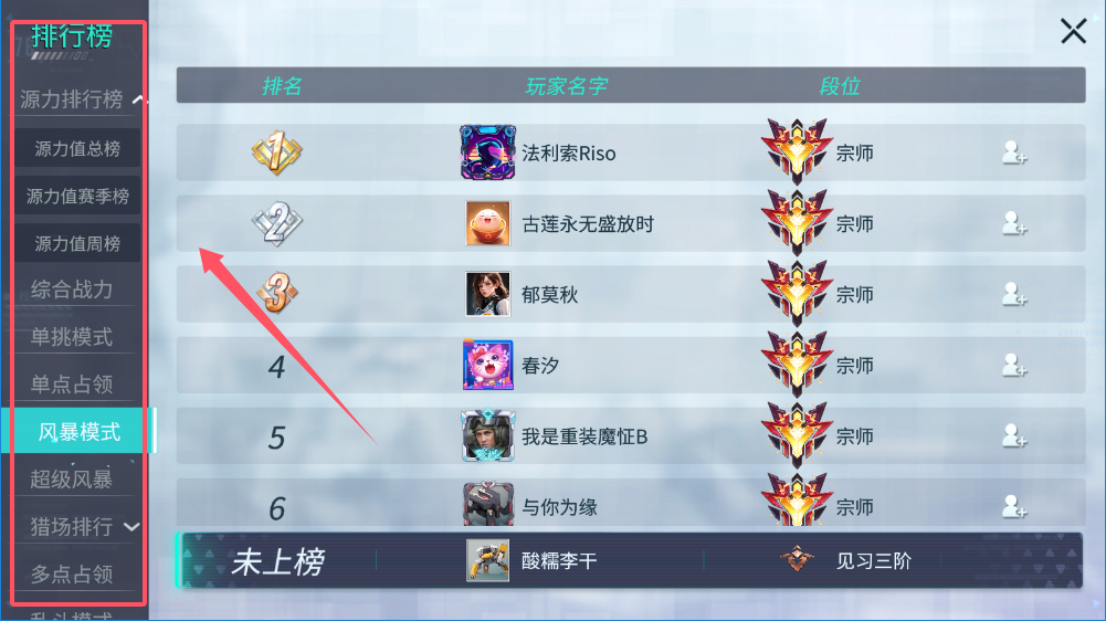 3、排行榜主界面会展示多种不同的排名类型,如图所示左侧是分类导航栏,包含“源力排行榜”、“综合战力”等多个选项,点击不同的分类可以看到相应的排名列表。